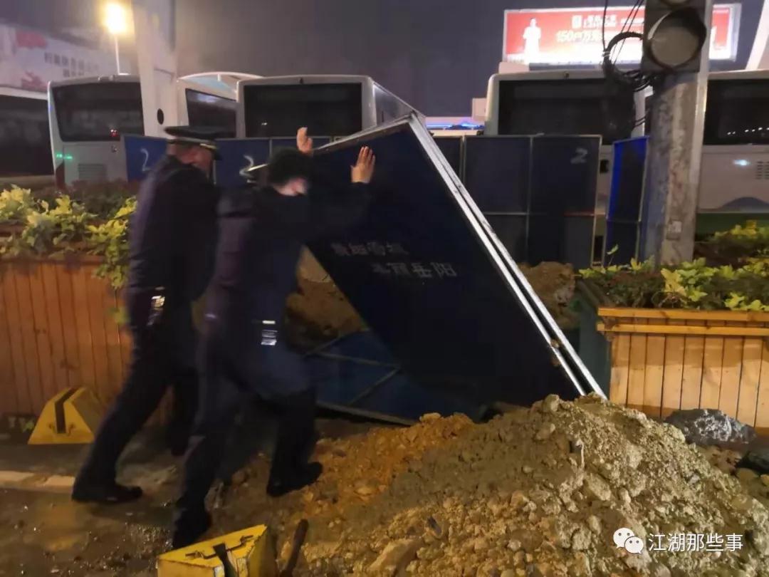 火车站智慧交通施工围挡因风力太大出现倒伏的安全隐患,市城管局火车站地区综合执法支队队员将其先行拆除并妥善放置,需要市城投集团及其施工单位待明天风力转小后及时装置围挡并予以加固。