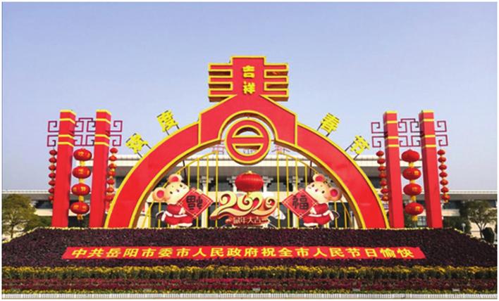 火车东站广场花坛以“春”元素为造型主题,下侧为“2020”字样及两只“福鼠”,表达鼠年之际市委市政府对全市人民的美好祝愿;造型两侧柱体及回字纹结构均取自于岳阳楼古建元素,充分表达区域特征,展现岳阳这座国家历史文化名城喜庆、祥和的节日氛围。