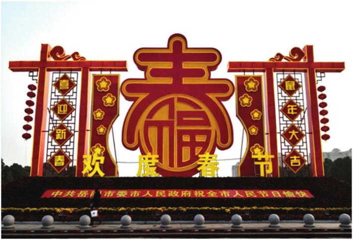 南湖广场的花坛将汉字“春”与“福”相结合,寓意“春来福到”,表达对全市人民的新春祝福;造型两侧为“红色窗格网”、“对联”、“灯笼”等家庭新年元素,突出热烈、欢庆的节日气氛,展现岳阳市民其乐融融、安定祥和的生活图景。