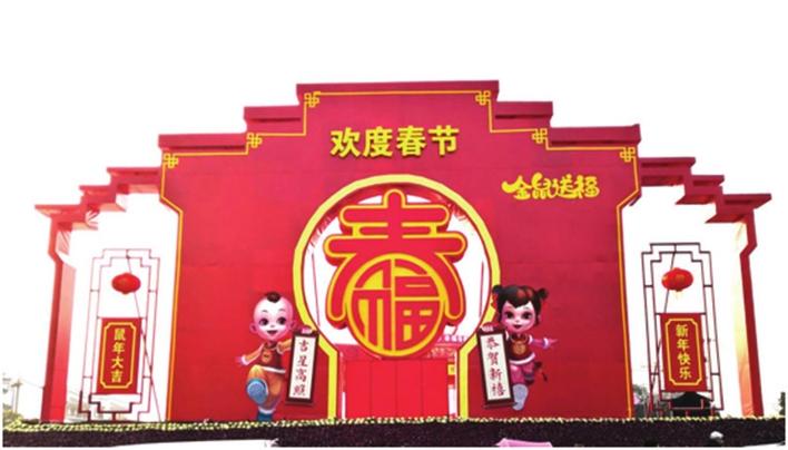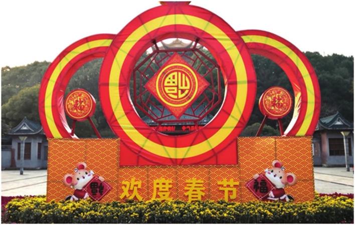 金鹗公园东门广场花坛以3个圆形为主体,环环相扣,体现和谐、融洽的氛围;灯笼、红鼓、福等春节元素,表达对市民的春节祝福。