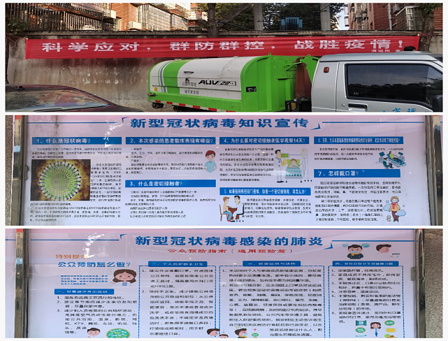 (环卫清运所悬挂横幅及更新宣传栏科普新冠肺炎知识内容)
