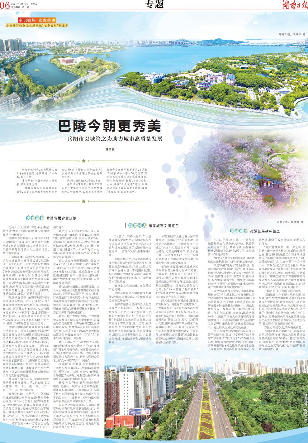 岳阳市城管局深入贯彻习近平新时代中国特色社会主义思想和党的二十大精神,认真落实市委市政府和省住建厅部署要求,坚决扛牢“守护好一江碧水”政治责任,始终将人民宜居安居放在重要位置,深入推进精细、智慧、文化、绿色、人本、平安“六大城管”建设,以城管之为助力城市高质量发展,绘就“幸福岳阳”的最美底色。
