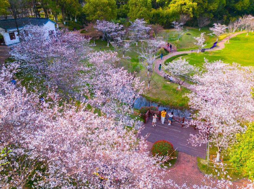莺飞草长,口袋公园内人群熙攘,享受惬意生活。