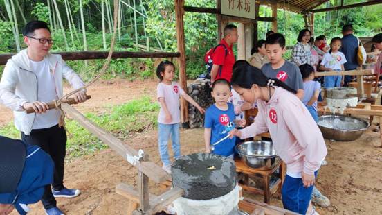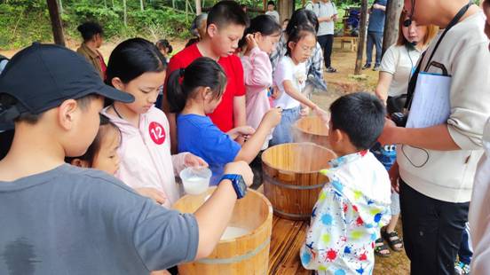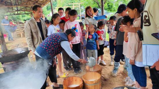 接着,大家来到加工坊,参与“豆子变形记”活动。通过合作磨豆、煮浆、点卤,制作并分享豆浆、豆腐脑、豆腐、千张、豆渣饼等美食,大家见证了黄豆从原料到美食的神奇转变,对食物制作过程有了更直观的认识。