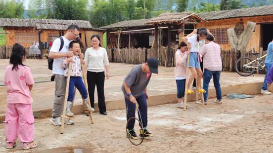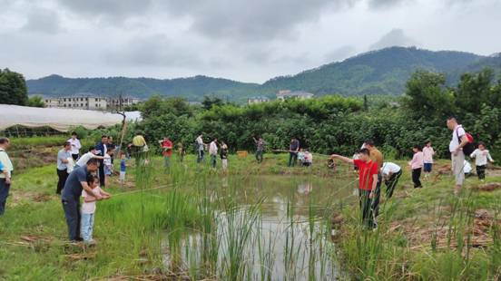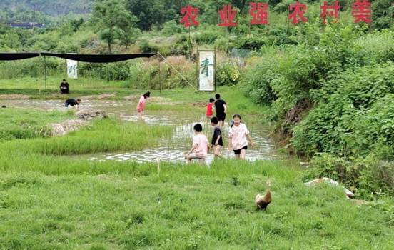游戏环节,孩子们重温了父母儿时的游戏——滚铁圈、踩高跷等,亲子之间欢声笑语、其乐融融。在自然指导员的带领下,家长和孩子们还赤着脚在池塘里捉鱼摸虾,在田野上追鸡赶鸭,“鸡飞狗跳”,好不热闹。