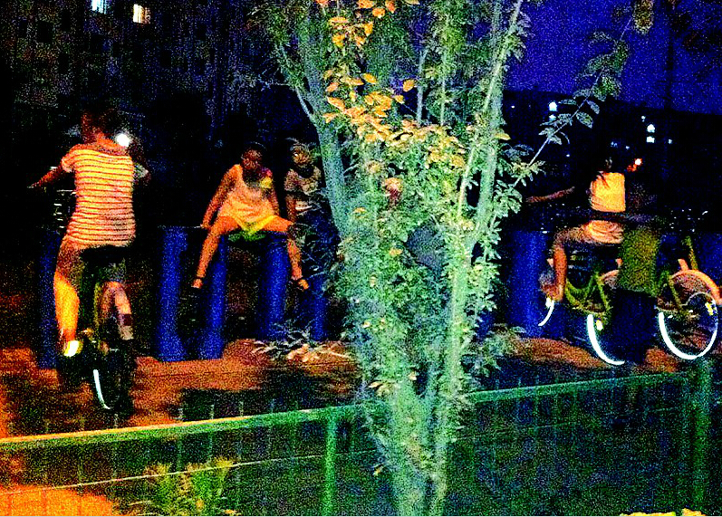 感谢一谭姓市民路过洛王刘家村附近的一存取点时,用手机拍下了正在朦胧夜色中倒蹬车“健身”的几个背影,并用微信转给记者。