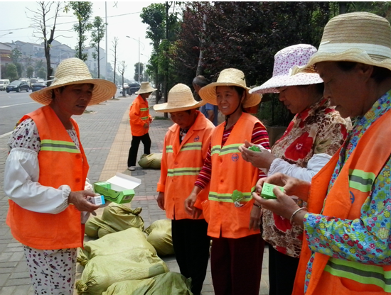 近日,连续的高温天气“烤问”着岳阳城区,也大大提高了从事道路清扫保洁环卫工人的工作强度。为避免高温天气造成环卫工人中暑,市环卫局城南清扫保洁管理所采购了3万斤西瓜、2000余盒风油精、500余盒霍香正气水、500余盒人丹丸、1000余瓶清凉油、200余袋夏桑菊等发放给环卫工人,并及时采取调整作业时间、尽量避免高温时段在户外作业、适当增加休息时间、发放安全作业卡等方法,给环卫工人带来一丝夏日的清凉。(徐敖)