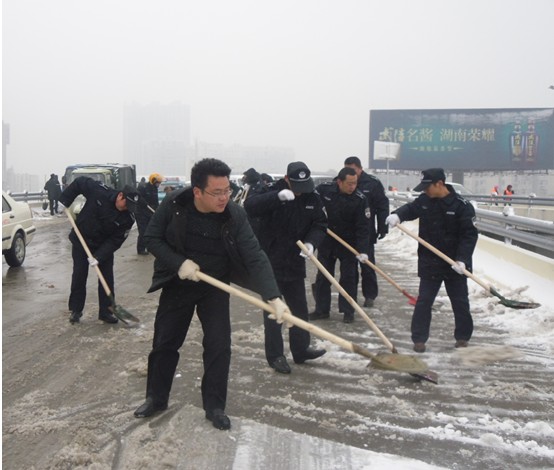 2014年2月9日上午,在市城管局的统一组织下,市城管行政执法支队50余名执法队员冒着严寒飞雪,在琵琶王立交桥等城区主干道上铲冰扫雪,为广大市民安全出行营造出良好的道路交通环境。
