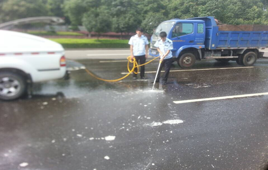 为有效遏制各类运输撒漏污染事件的发生,维护干净整洁的市容环境,连日来,市环卫局市容管理办公室采取分片包干、蹲点把守的办法,切实强化对窗口路段和入城路口的巡查监管力度,并成立专门的应急队伍对道路突发污染进行高效清洗。图为9月13日该办执法队员对巴陵大道被污染的路面进行冲洗。