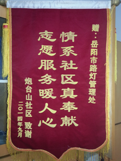 9月15日,我市炮台山社区的工作人员将一面写有“情系社区真奉献 志愿服务暖人心”的锦旗送至岳阳市路灯管理处,对于该处在开展“党员进社区、竞赛当‘五员’”主题活动中对社区做出的奉献表示由衷的感谢。