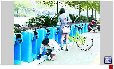 图为黄慧红正在仔细擦洗公共自行车站点