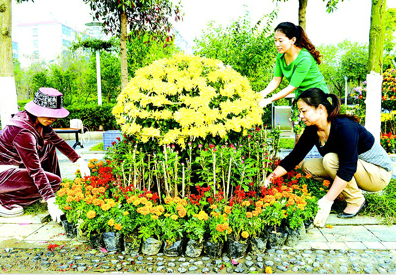 菊花金鹗,花韵巴陵。市大型菊花展览会11月1日将在金鹗公园隆重举行,数万盆上十个品种的秋菊将以五彩绚丽的姿色展现在市民眼前。图为园林工人正在摆设菊花盆景。