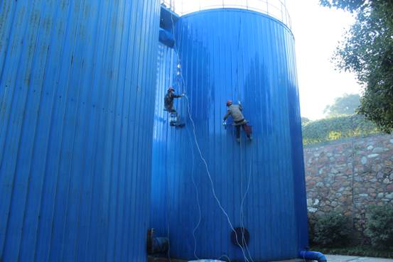 花果畈垃圾场积极开展文明创建,该场在坚持日常生产以“迎检常态化”标准运行的同时,进一步强化措施,对场内设施设备进行了一次全面的检修,并对易腐蚀、锈化的设施进行了维护,图为施工人员正在对垃圾渗滤液处理反硝化罐进行防腐、防锈及“靓”化处理。