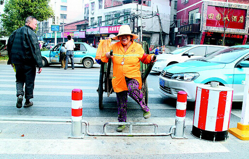 据环卫工人张师傅介绍,以前人行道中间有几条约20公分高的护栏,主要是为了防止摩托车在此随意掉头,影响交通秩序。但是,这些护栏也给推着垃圾车的环卫工人带来了不便。洛王街道办事处辖区有99名环卫工人,他们为了过马路,不得不绕道走上3里路,或者由两个环卫工人将沉重的垃圾车抬过护栏。