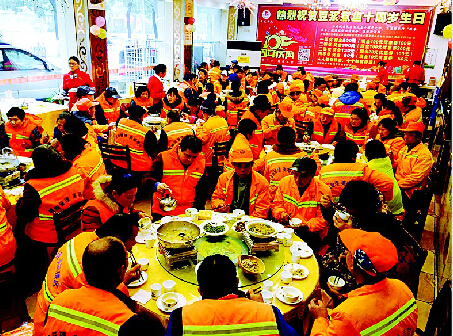 1月5日上午11时许,位于花板桥的豆浆煮鱼餐馆门前,陆陆续续走来了一些身穿“黄马甲”制服的环卫工人。他们没有带扫把,也不是来搞清洁工作的。时间越来越接近饭点,走进饭店大堂的环卫工人越来越多。这样热闹的场面并非迎亲喜宴,原来,他们是在饭店老板何时中和何潺中两兄弟的邀请下,专门来吃大餐的!“早上5点就出来进行第一遍的清扫,一直扫到晚上5点多,中午最忙,没时间回去吃饭,只能带饭。”今年53岁的李平英是一位环卫工人,负责兰竹街的卫生工作。“我从九中后门扫起,一直要扫到步步高这里,每一趟需要两个多小时。”因为中午九中学生放学吃饭,人流量很多,垃圾量也很大,没办法,李平英不能回家吃午饭,只能从家里带饭,到相熟的店铺里热一热,然后蹲在路边吃饭。“我们没有专门休息的地方,累了,饿了,也只能蹲在马路边上休息一下。”