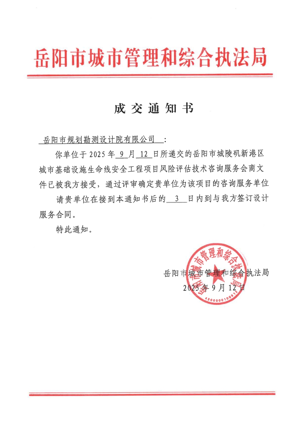 岳阳市城陵矶新港区城市基础设施生命线安全工程项目风险评估技术咨询服务成交通知书