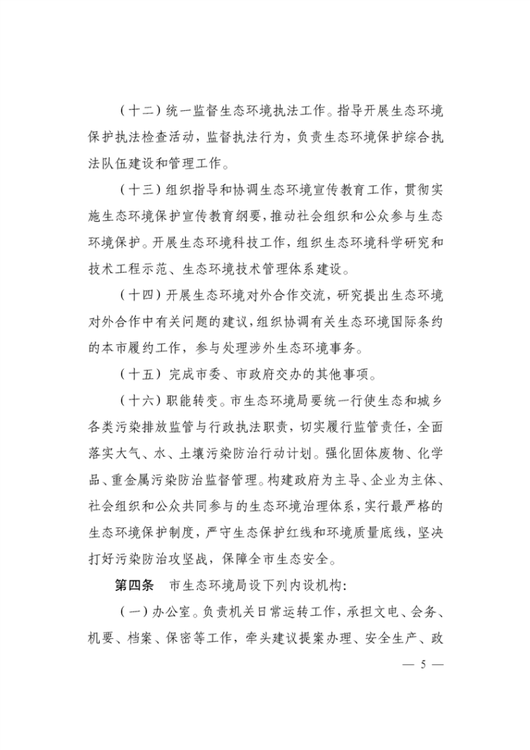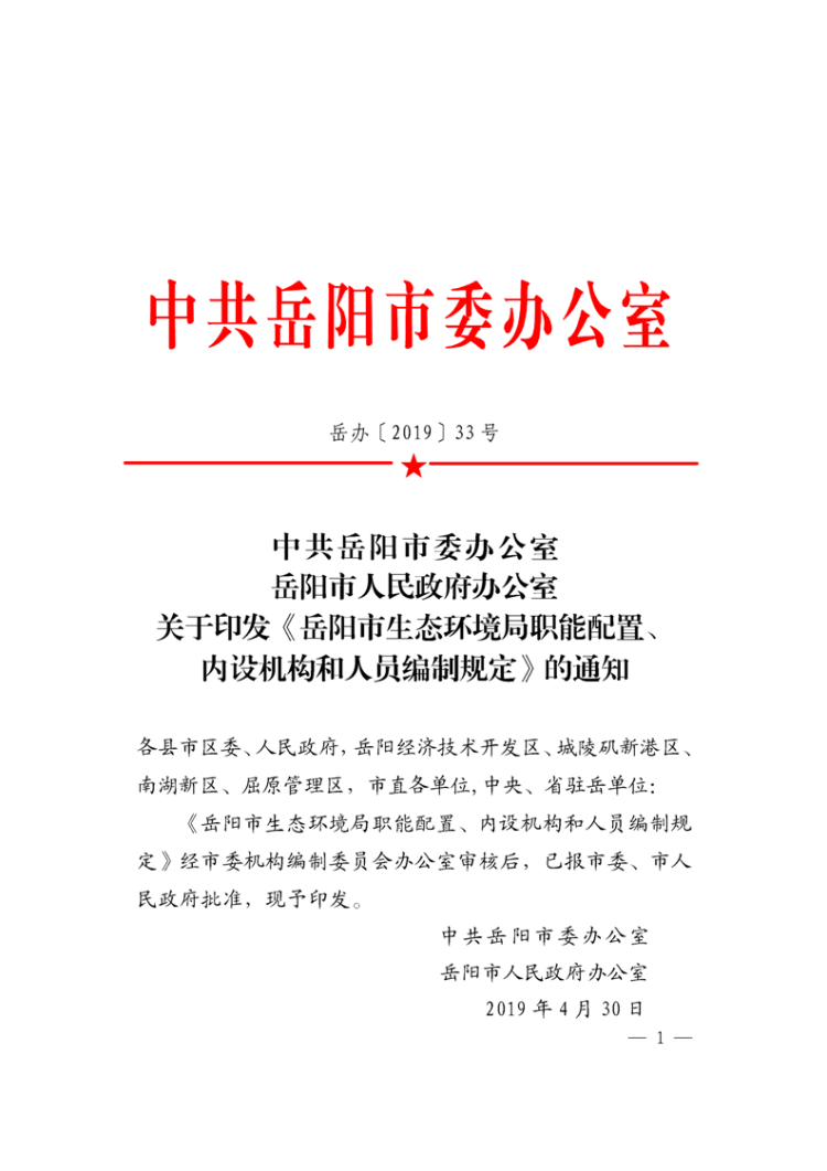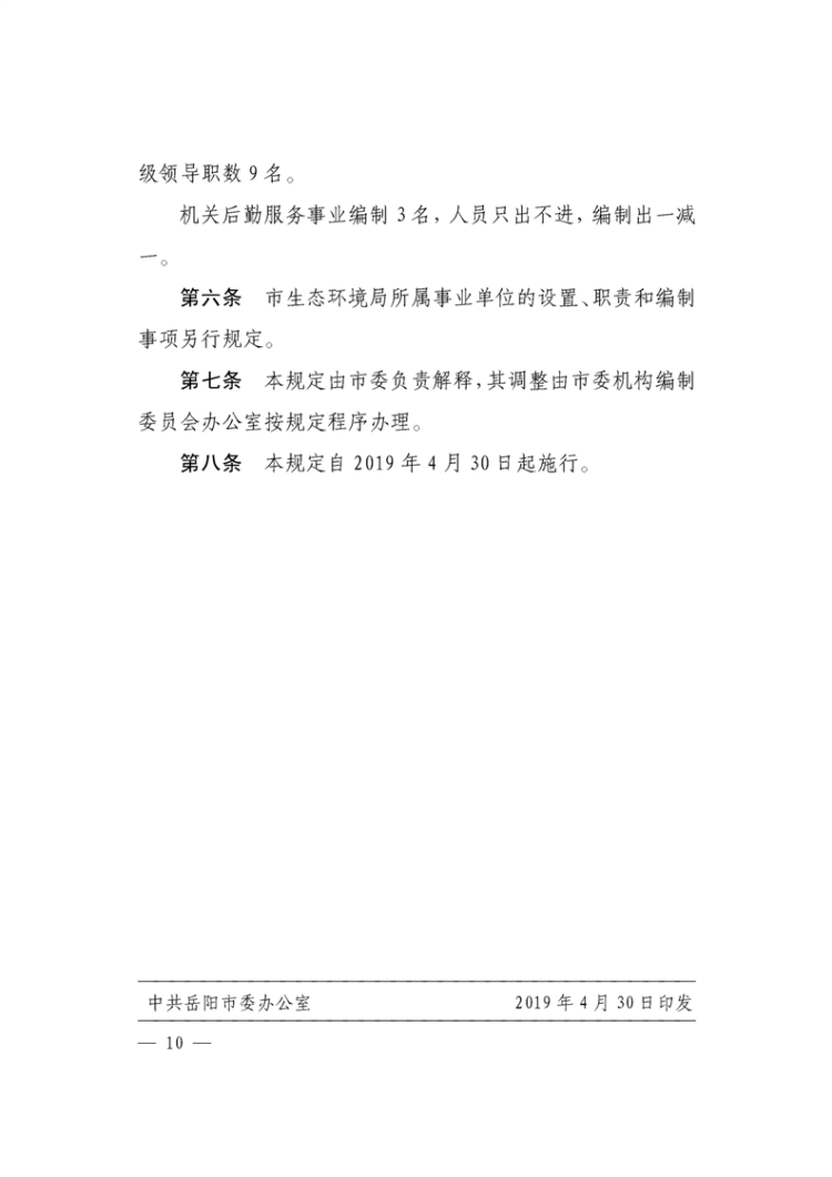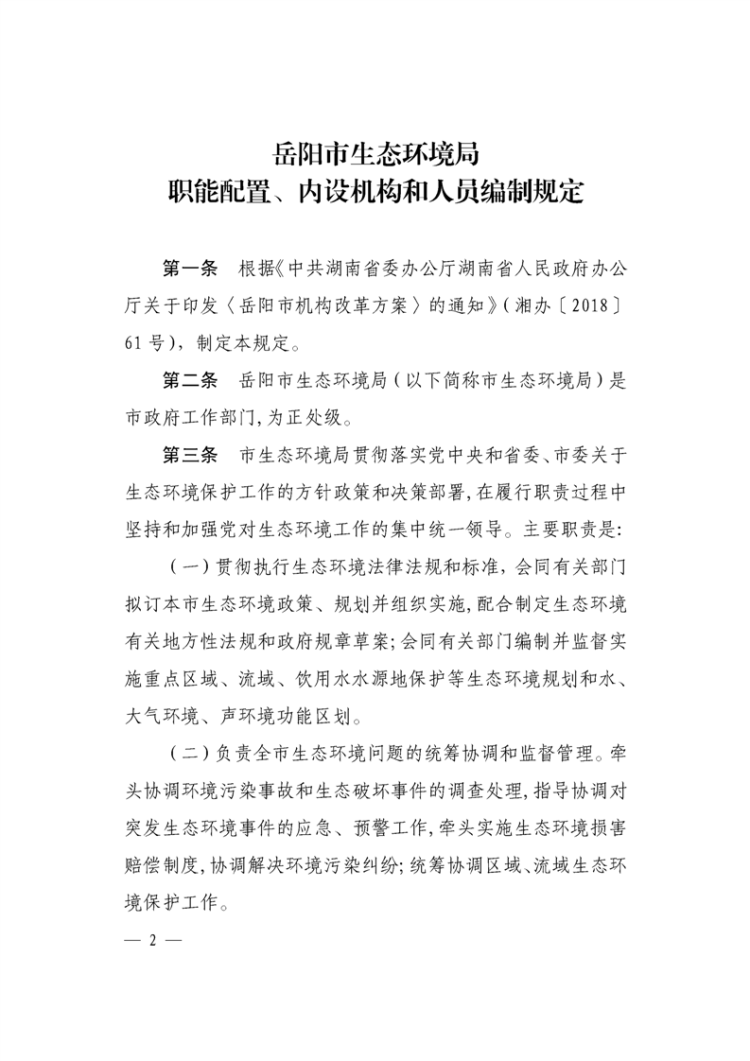 岳阳市生态环境局职能配置、内设机构和人员编制规定