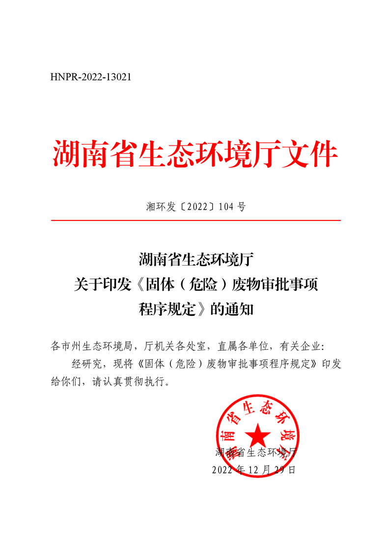 关于印发《固体(危险)废物审批事项程序规定》的通知