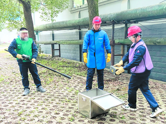 不过您别急,这是我市为全面提升和改善应对突发辐射事故防范能力开展的2020“平安岳阳”辐射事故综合应急演习, 模拟检修人员发现料位计源罐开关锈蚀,料位计在拆卸过程中不慎掉落受损,Ⅳ类放射源铯-137失控,检修人员佩戴的剂量 报警仪出现报警。