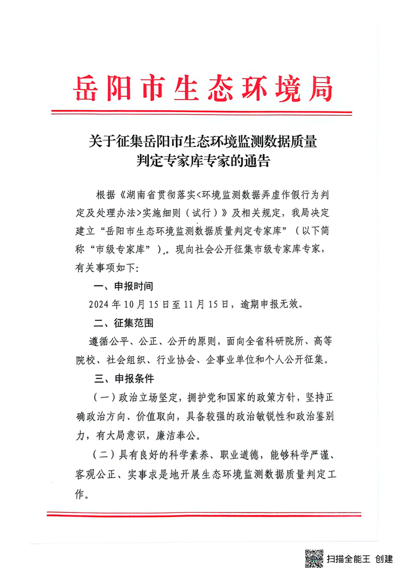 关于征集岳阳市生态环境监测数据质量判定专家库专家的通告