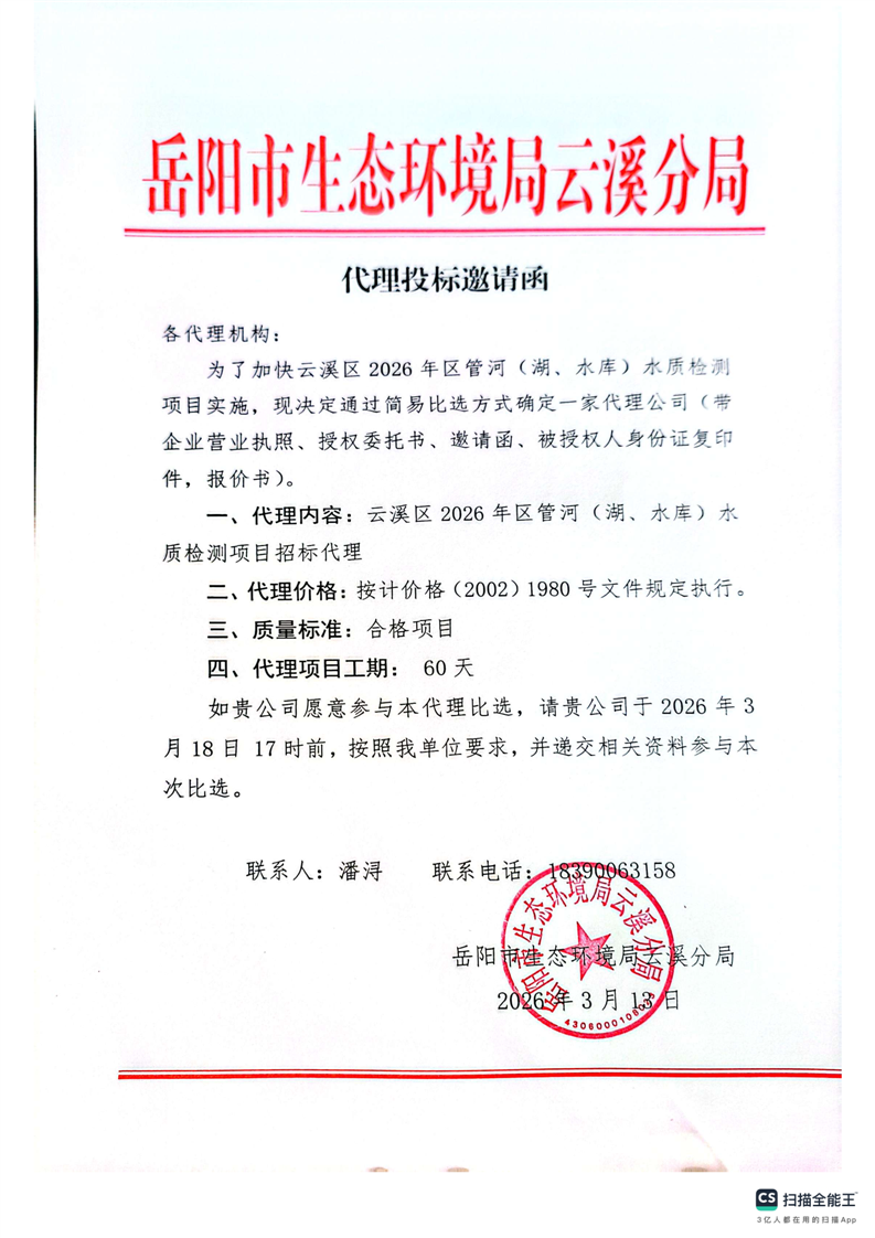 关于云溪区2026年区管河(湖、水库)水质检测项目代理邀请函的公示