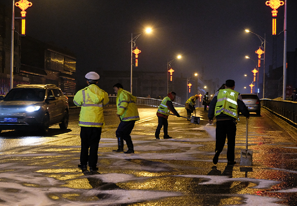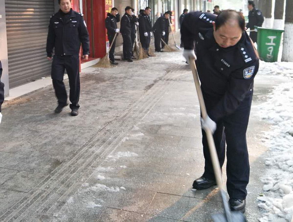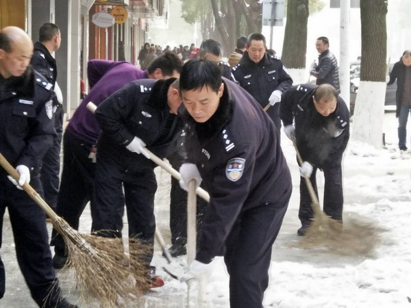 26日,气温持续走低,降雪冰冻灾害严重,车辆行人通行困难。汨罗市局决定对全局民警取消本周双休日,全警上路保畅,做好应对低温雨雪冰冻天气防范工作。该局全体民警分路段负责主要交通要道,不分昼夜,加班加点,上路值勤,扫雪除冰,确保道路交通安全畅通。