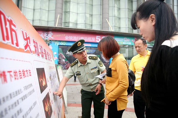 在花板桥步步高购物广场与青年中路沃尔玛广场,消防宣传人员精心准备了消防宣传资料、宣传横幅和宣传展板。在消防宣传咨询点,宣传人员向市民发放了包含如何报火警、如何扑救初起火灾、如何开展火场逃生自救、如何使用灭火器等消防常识以及各类家庭消防安全知识的宣传资料,详细地向市民讲解如何正确拨打119电话报警、如何开展隐患自查、如何进行火灾隐患举报以及如何进行初期火灾扑救等消防小常识,并对部分热心群众讲述了地震成因、紧急避震、自救互救以及民房抗震设防等防震避震知识。