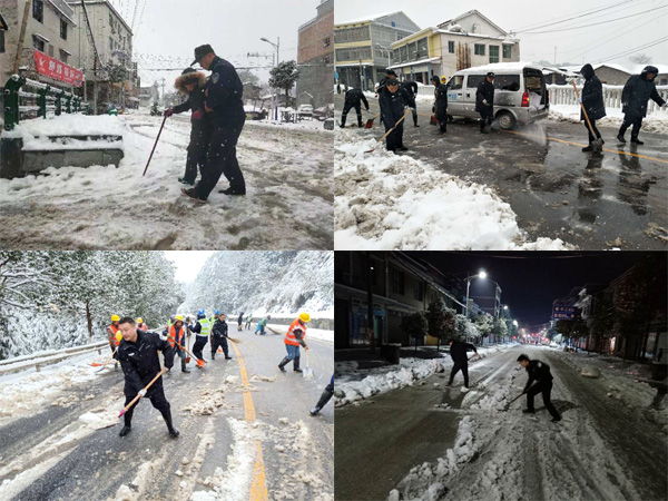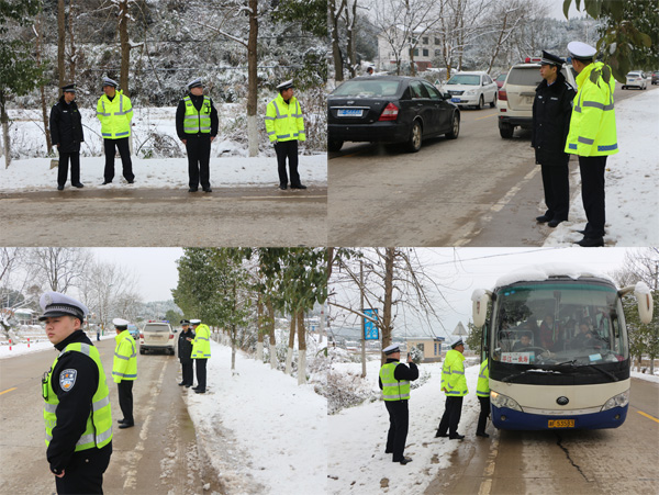29日晚,平江境内开始下雪,气温在零度以下。各派出所启动巡逻巡查,对辖区县乡道、村级公路进行排查。在辖区交通干道、桥梁有积雪、易结冰的地段设立警示牌,并立即向地方党委政府报告,会同乡镇干部和人民群众一起融雪铲冰,确保省道畅安。交警全警出动,上路巡查,30日清晨又出动,一夜仅休息三四个小时。同时加强与气象、公路、交通部门的协作联动,利用“三微”平台、交通诱导屏等发布天气、路况信息,引导驾驶员安全出行。