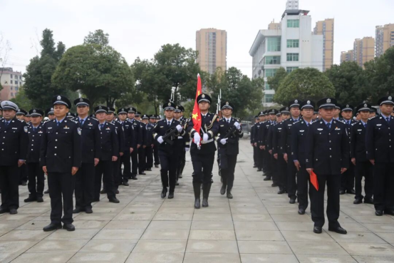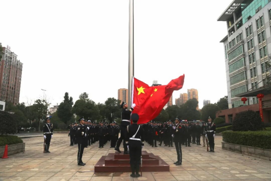 上午9时,伴随着嘹亮的指挥口令,仪仗队伍英姿挺拔、步伐铿锵,护卫国旗庄严入场,仪仗标兵分列国旗台两侧持枪伫立。在雄壮激昂的国歌声中,五星红旗冉冉升起、迎风飘扬。全体民警辅警面向国旗庄严敬礼、齐声高唱,表达对伟大祖国的深情礼赞,唱响忠诚担当的时代强音,共同祝福伟大祖国繁荣昌盛。