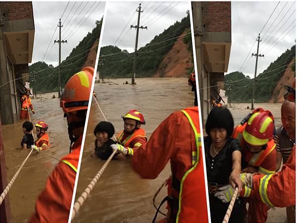 凌晨5时许,三阳乡圆拱桥处由于暴雨,水位已逼近楼房二楼,且周边多为老旧建筑,随时有倒塌的危险,大量群众被困。接警后,刚刚结束一起救援的大队官兵,来不及休息又马不停蹄的赶赴现场。到达现场后,通过观察发现,由于内涝,导致桥下多条道路被淹,车辆无法通行。指挥员果断下令,要求驾驶员将车停在高处,所有人员下车将橡皮艇徒步抬至受灾水域,带领两名战士携带救援装备,利用橡皮艇划水至受灾楼房下进行救人,由于水位已经相当高,进入楼梯间的空间已十分狭窄,指挥员通过观察现场情况,立即安排人员平躺于橡皮艇中进入楼道区,将被困群众一名一名的接至橡皮艇上,因被困人员较多,且水位仍在上涨,时间非常紧迫,通过近一个半小时的救援,终成功将该区域的全部被困群众转转移到安全区域。