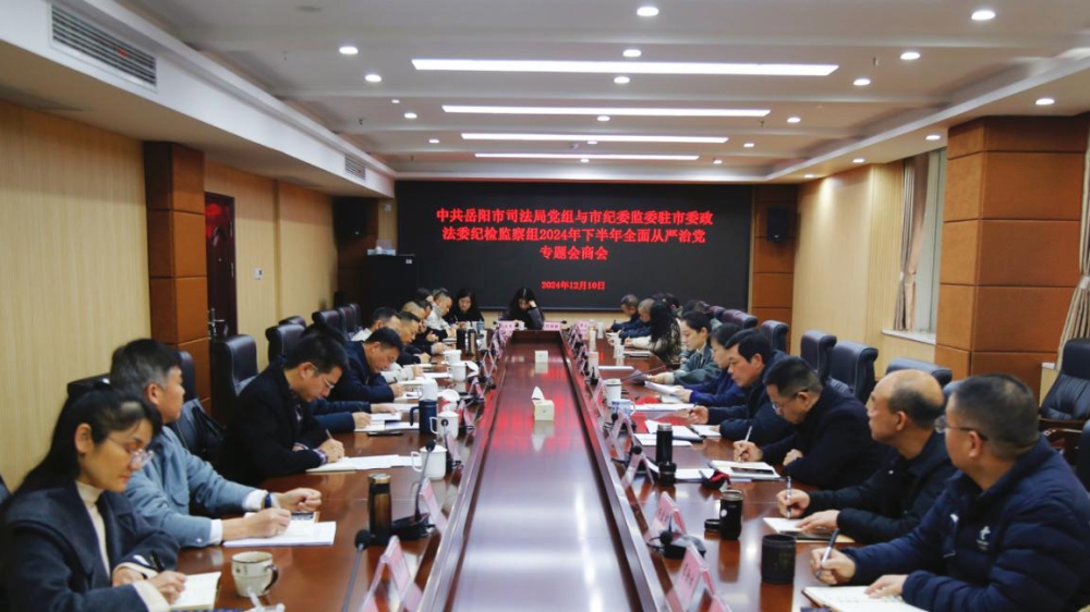 12月10日上午,中共岳阳市司法局党组与市纪委监委驻市委政法委纪检监察组召开2024年下半年全面从严治党专题会商会,党组书记、局长李峰主持会议,市纪委监委驻市委政法委纪检监察组组长周晓峰出席会议并讲话。派驻纪检组全体成员,市司法局领导班子,机关各科室、局直单位负责人参加会议。