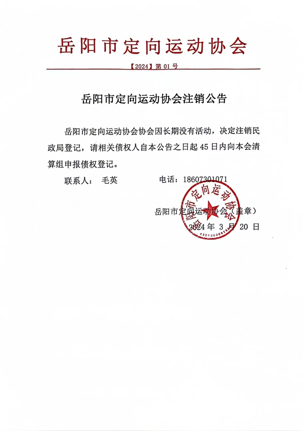 岳阳市定向运动协会注销公告