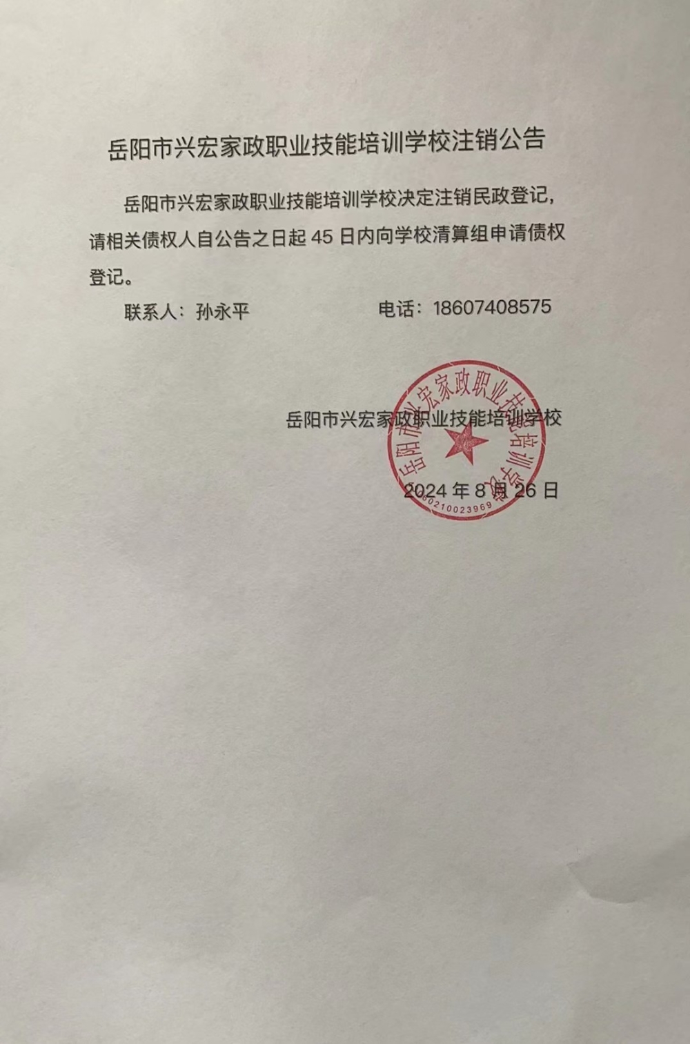 岳阳市兴宏家政职业技能培训学校注销公告