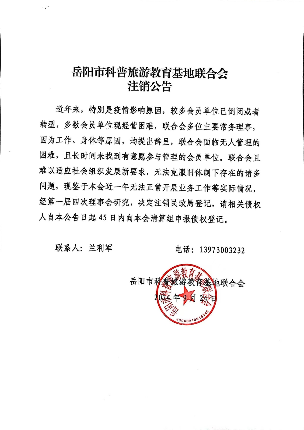岳阳市科普旅游教育基地联合会注销公告