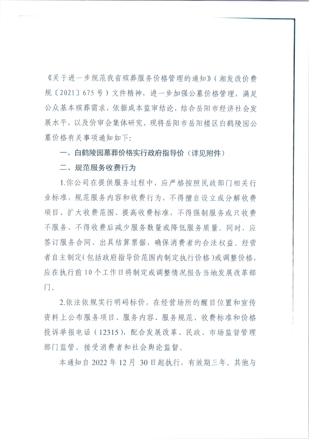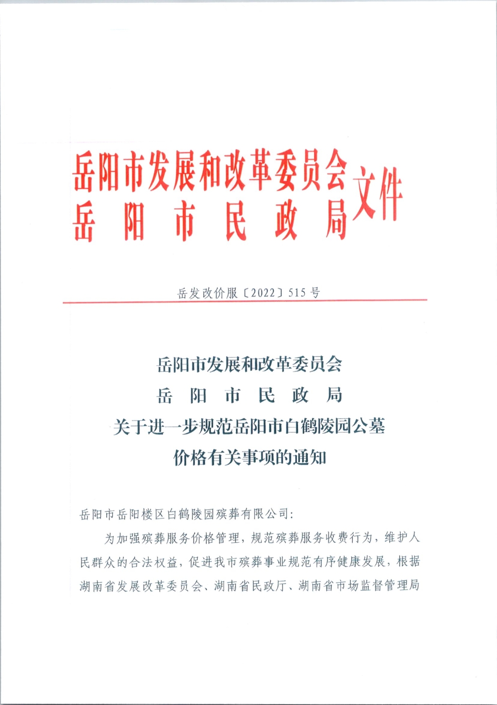 关于进一步规范岳阳市白鹤陵园公墓价格有关事项的通知