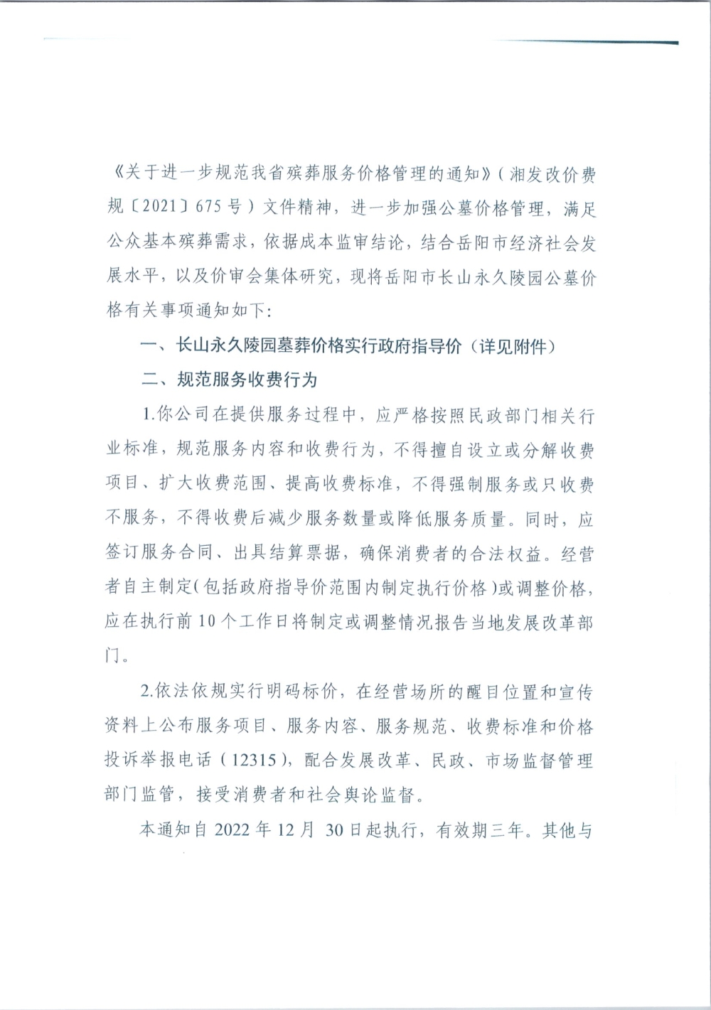 关于进一步规范岳阳市长山永久陵园公墓价格有关事项的通知