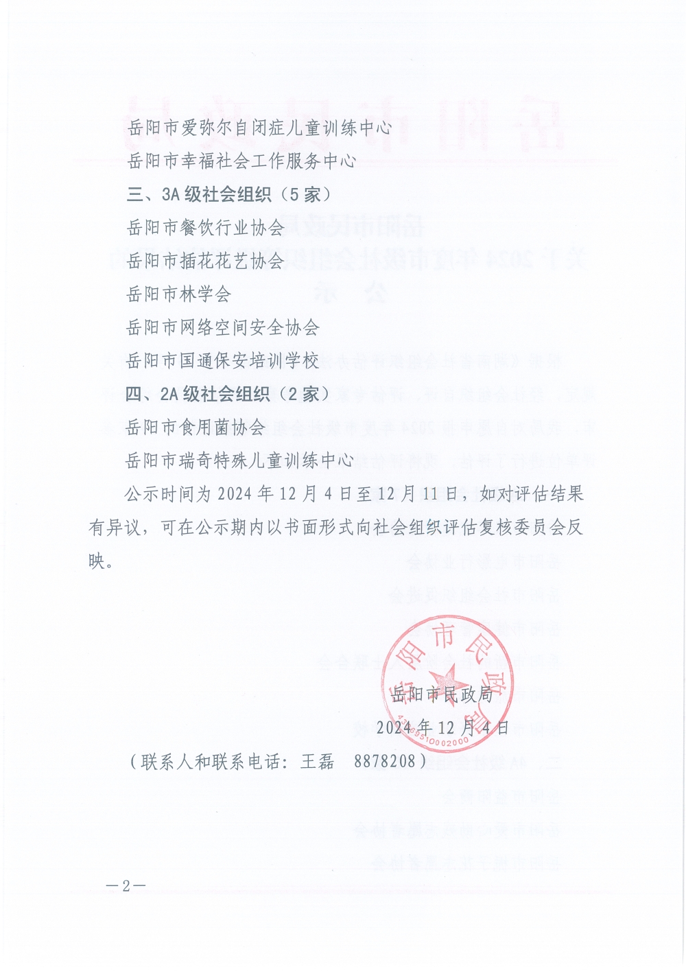 岳阳市民政局关于2024年度市级社会组织等级评估结果的公示