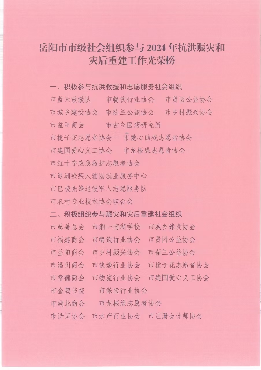 岳阳市市级社会组织参与2024年抗洪赈灾和灾后重建工作光荣榜