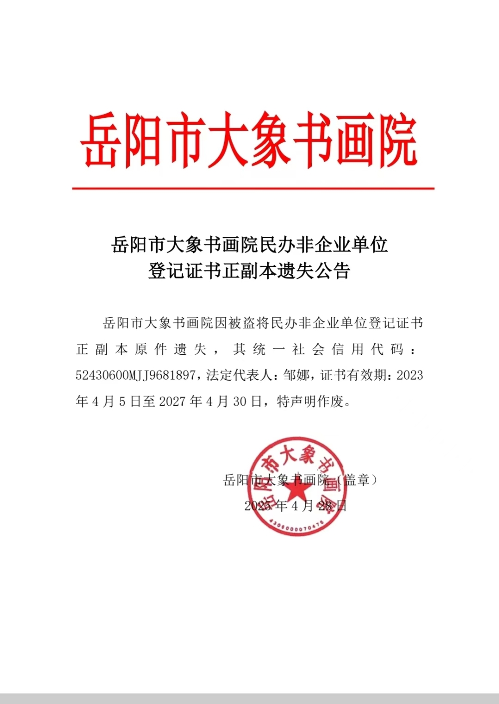 岳阳市大象书画院民办非企业单位登记证书副本遗失公告