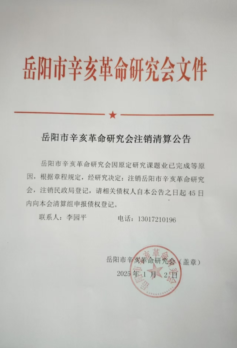 岳阳市辛亥革命研究会注销清算公告