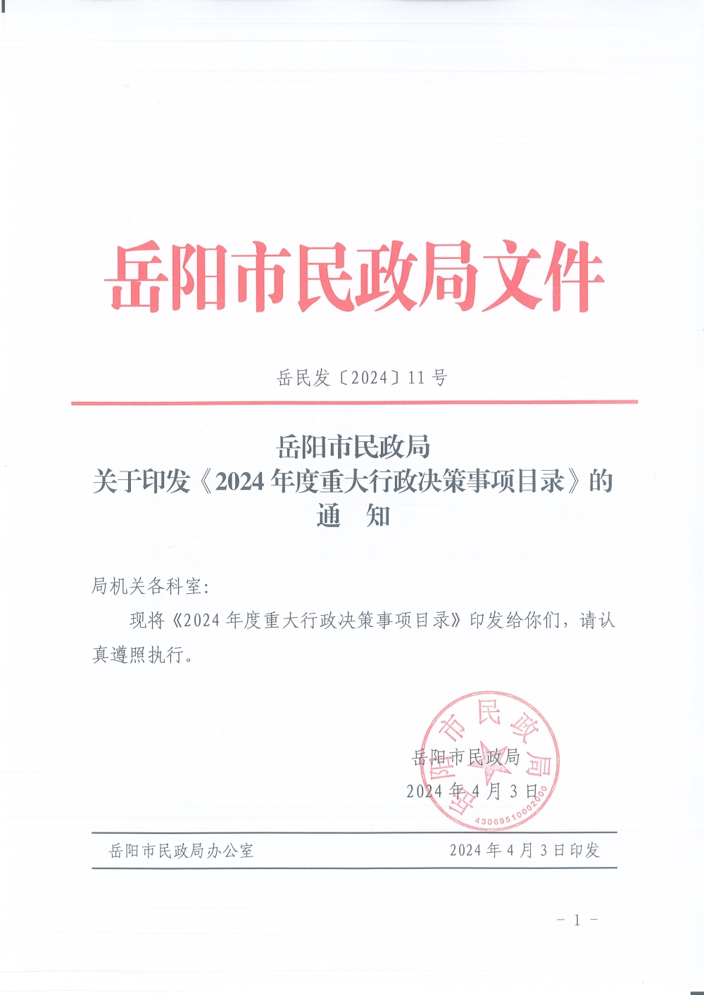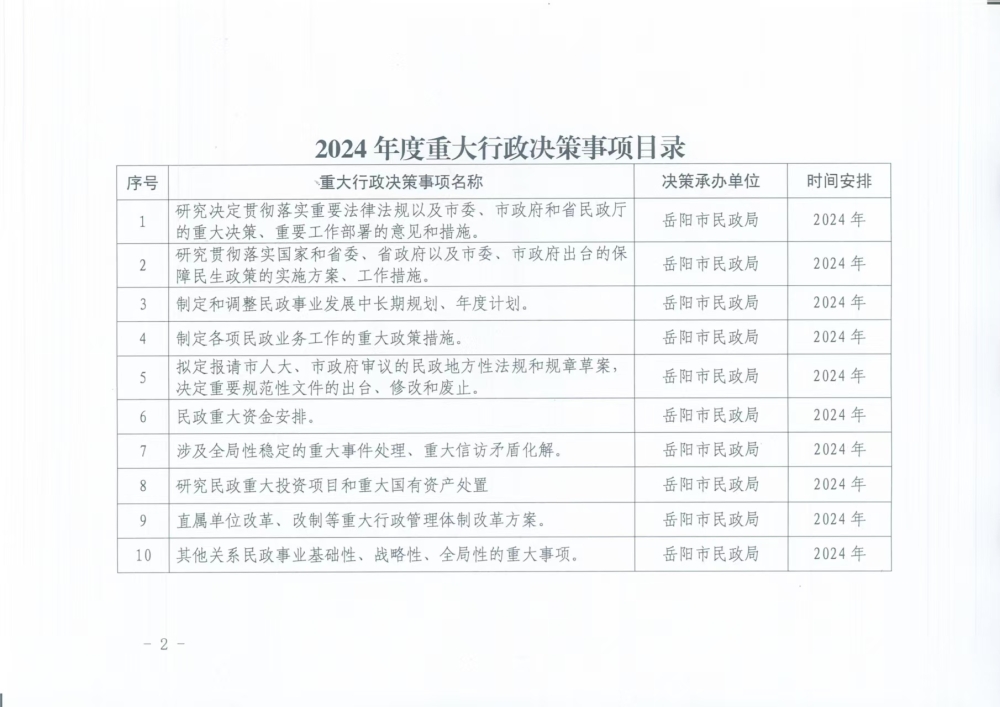 岳阳市民政局关于印发《2024年度重大行政决策事项目录》的通知