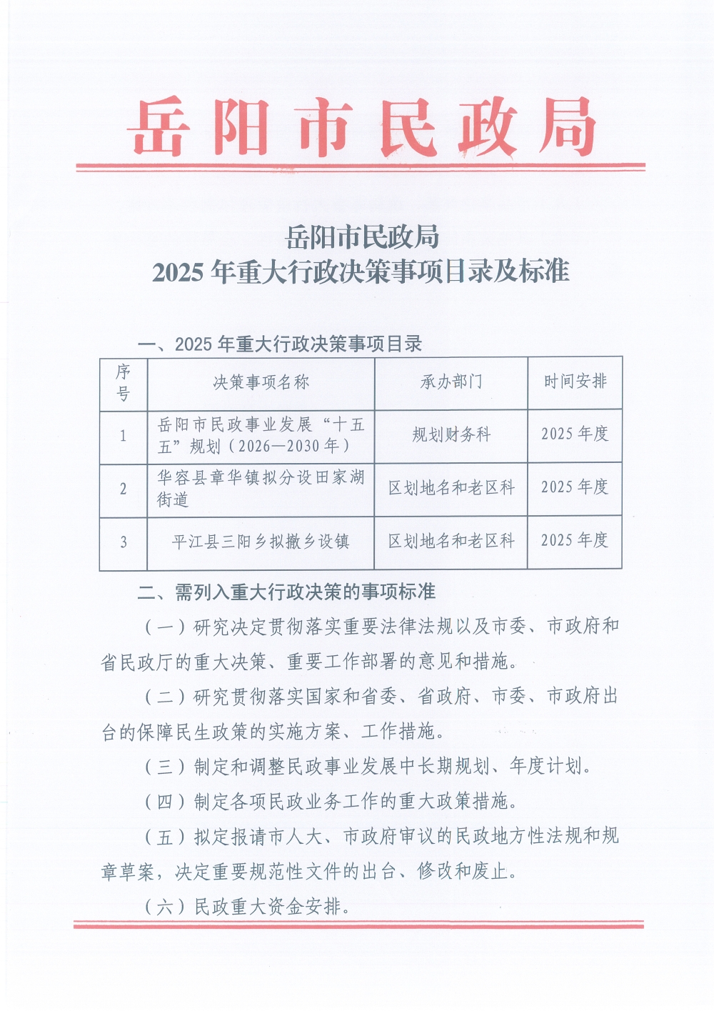 岳阳市民政局2025年重大行政决策事项目录及标准