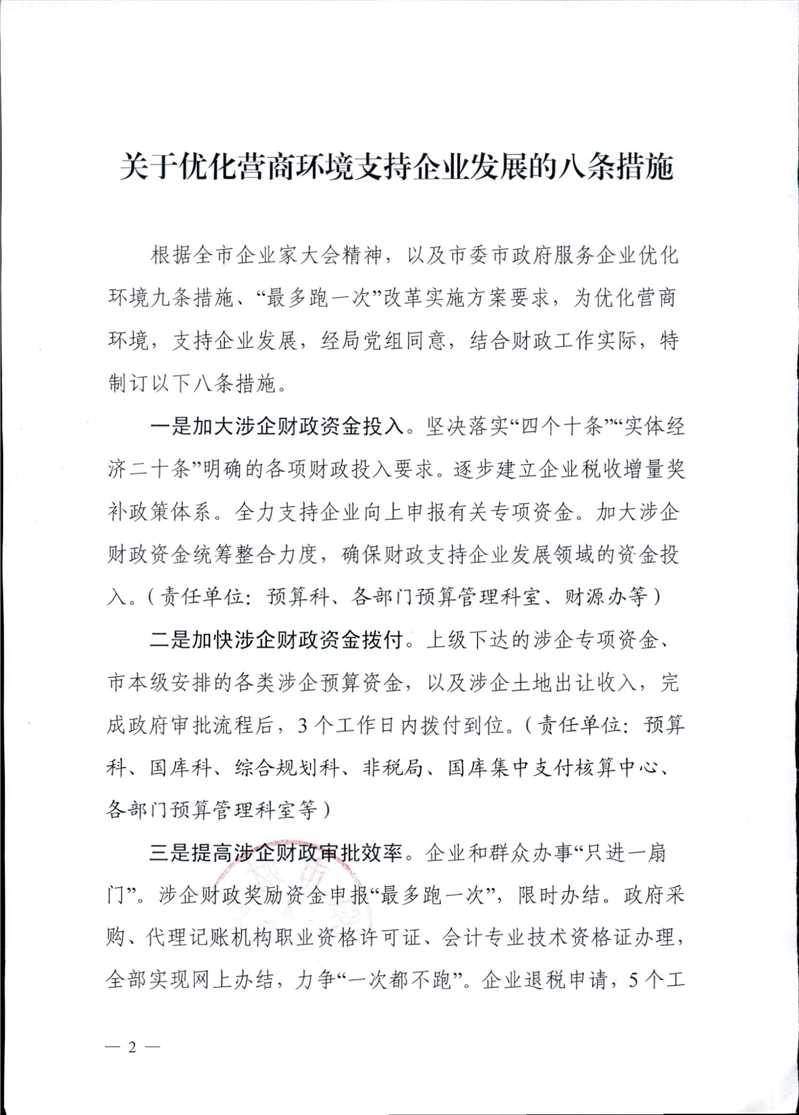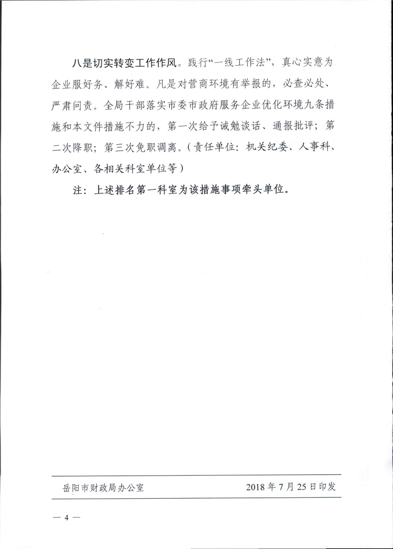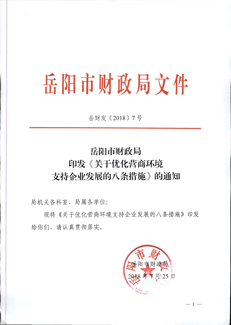岳阳市财政局印发《关于优化营商环境支持企业发展的八条措施》的通知(岳财发〔2018〕7号)