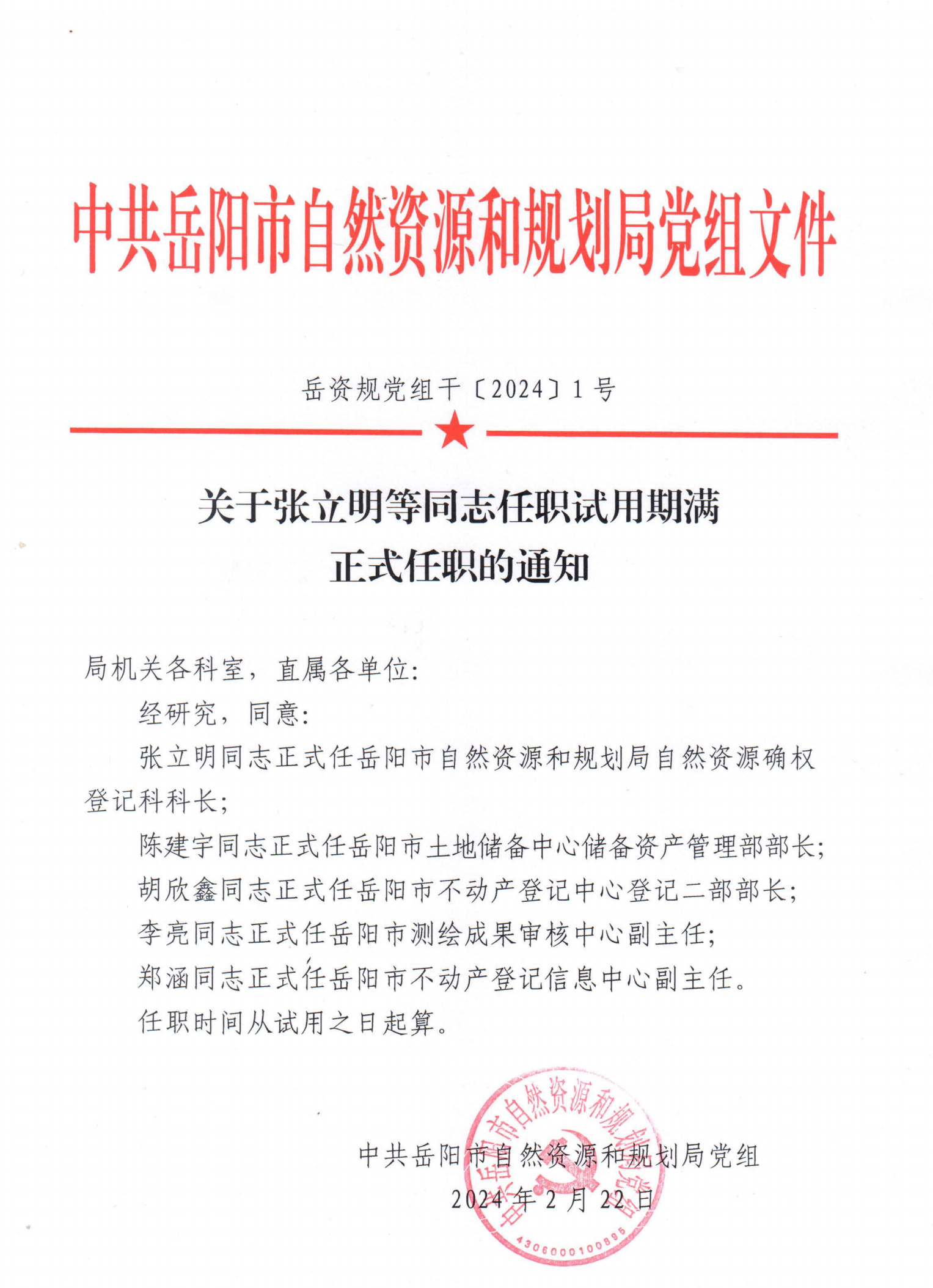 关于张立明等同志任职试用期满正式任职的通知
