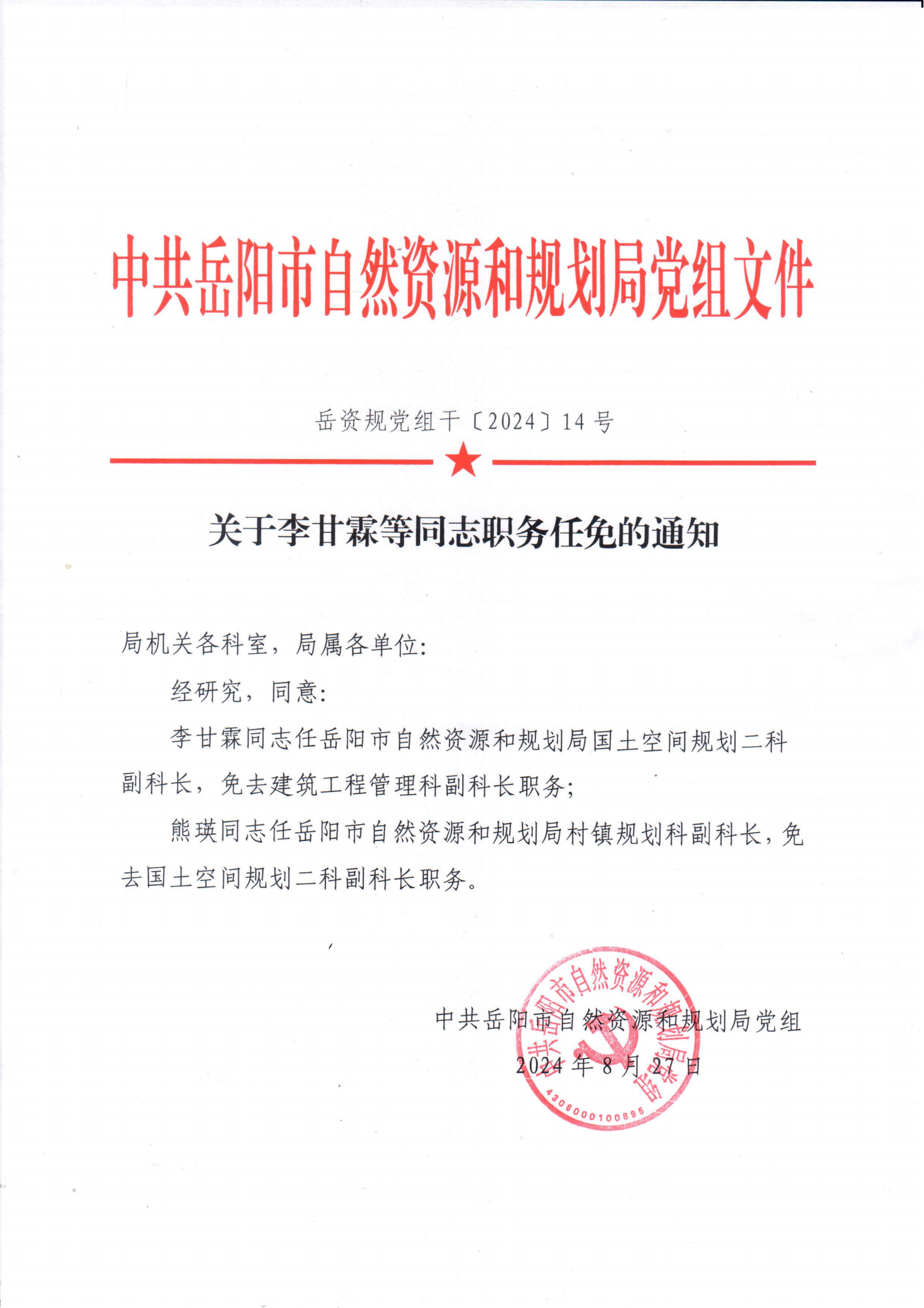 关于李甘霖等同志职务任免的通知