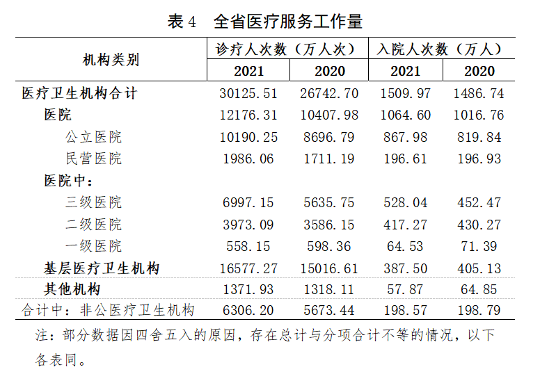 (一)门诊和住院量(见表4)。2021年,全省医疗卫生机构总诊疗人次30125.51万,比上年增加3382.81万人次(增长12.65%)。2021年居民平均到医疗卫生机构就诊4.55次。