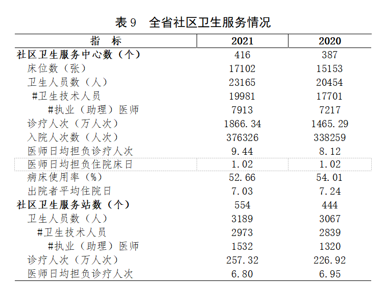 2021年,全省社区卫生服务中心诊疗人次1866.34万,入院人次37.63万;平均每个中心年诊疗量44864人次,年入院量905人次;医师日均担负诊疗9.44人次、住院1.02床日。2021年,全省社区卫生服务站诊疗人次257.32万,平均每个站年诊疗量4645人次,医师日均担负诊疗6.80人次。