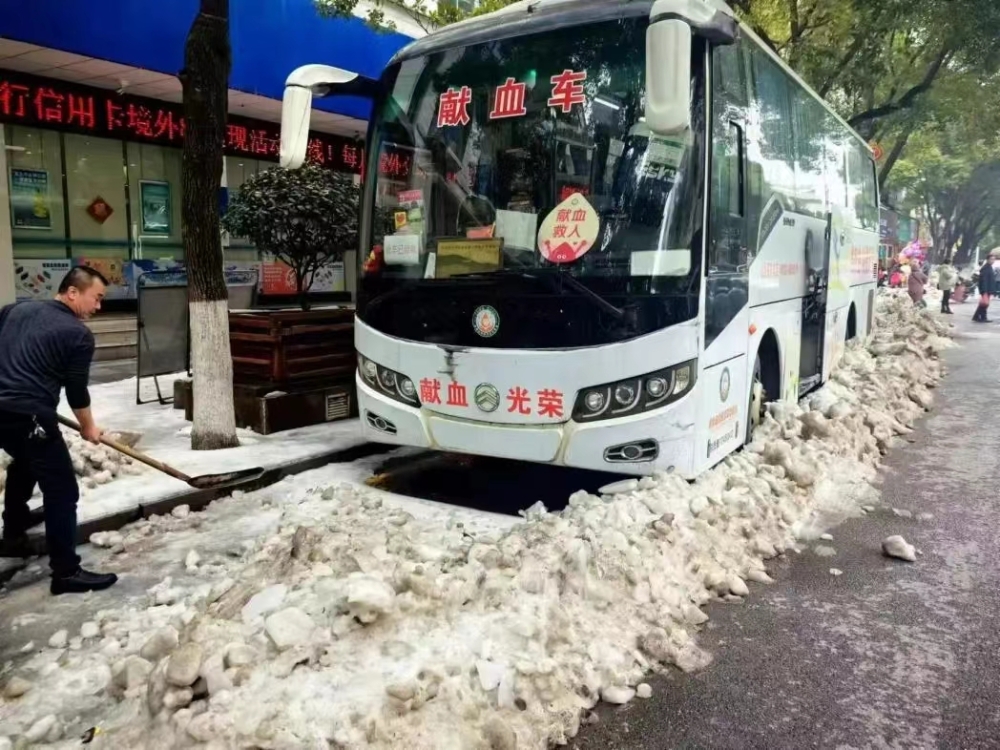 献血车冒着雨雪赶赴各乡镇宣传招募。