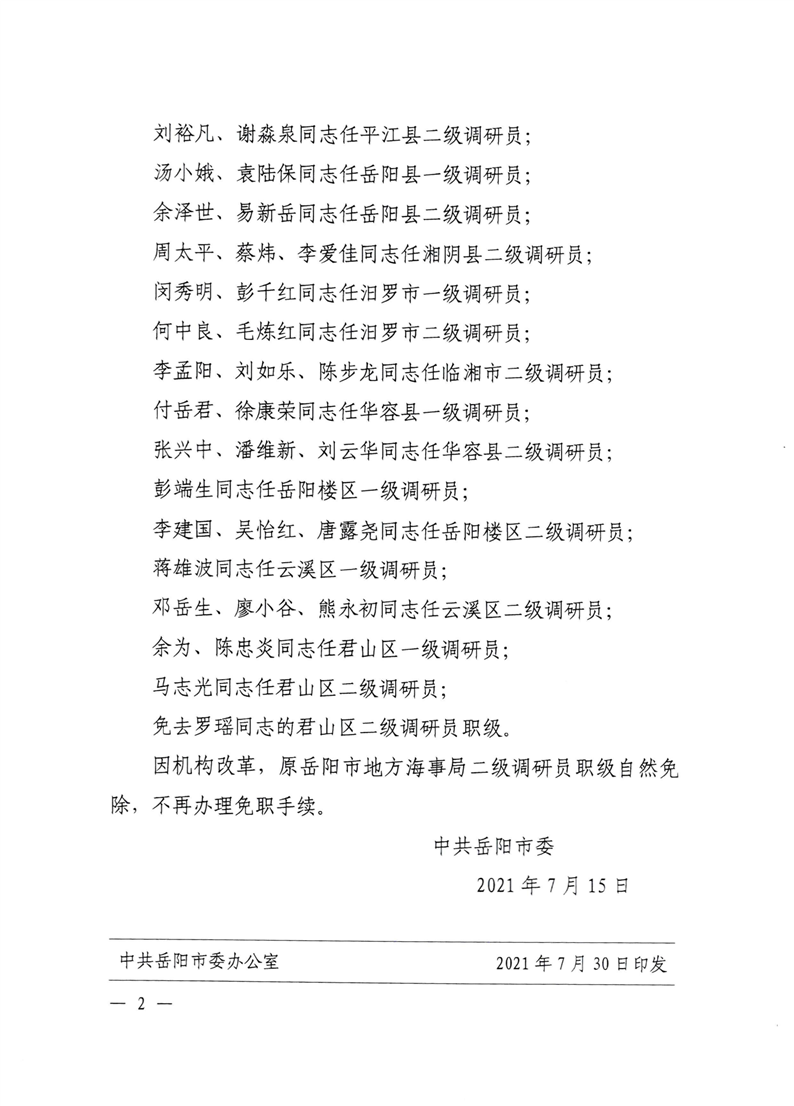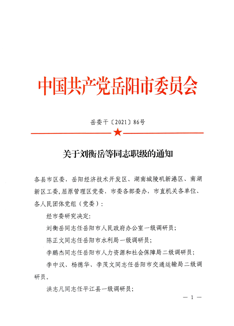 关于刘衡岳等同志职级的通知