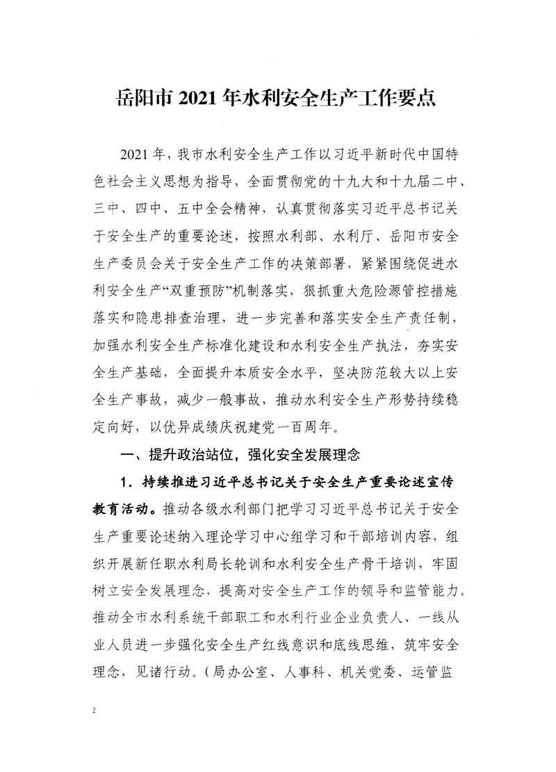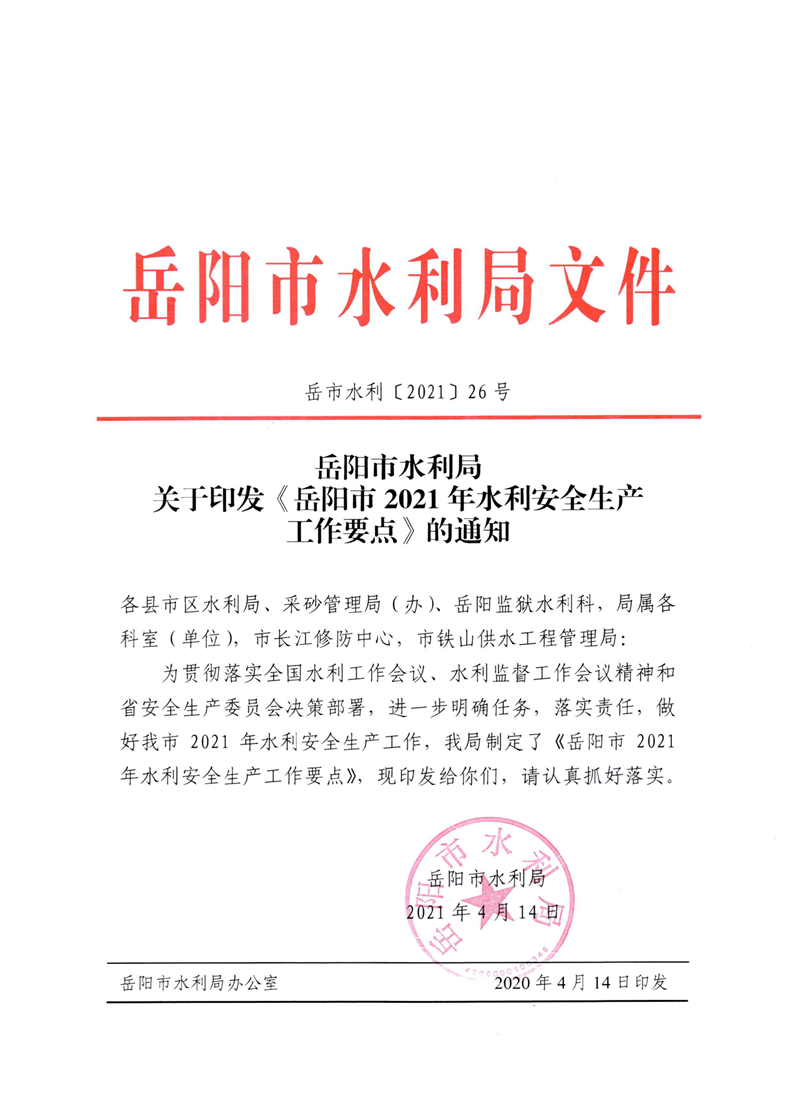 岳阳市水利局关于印发《岳阳市2021年水利安全生产工作要点》的通知